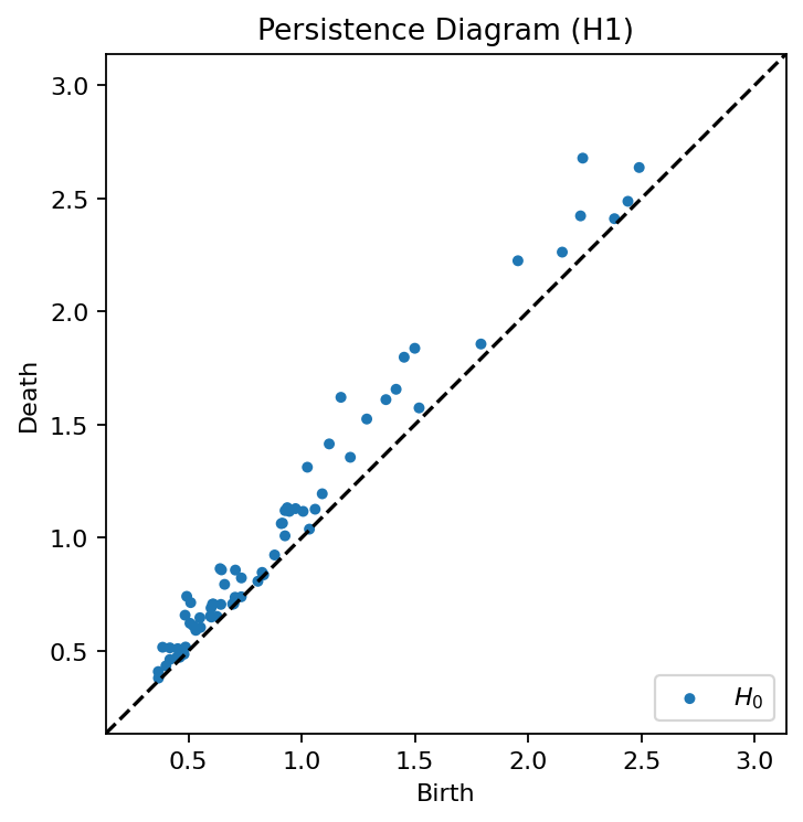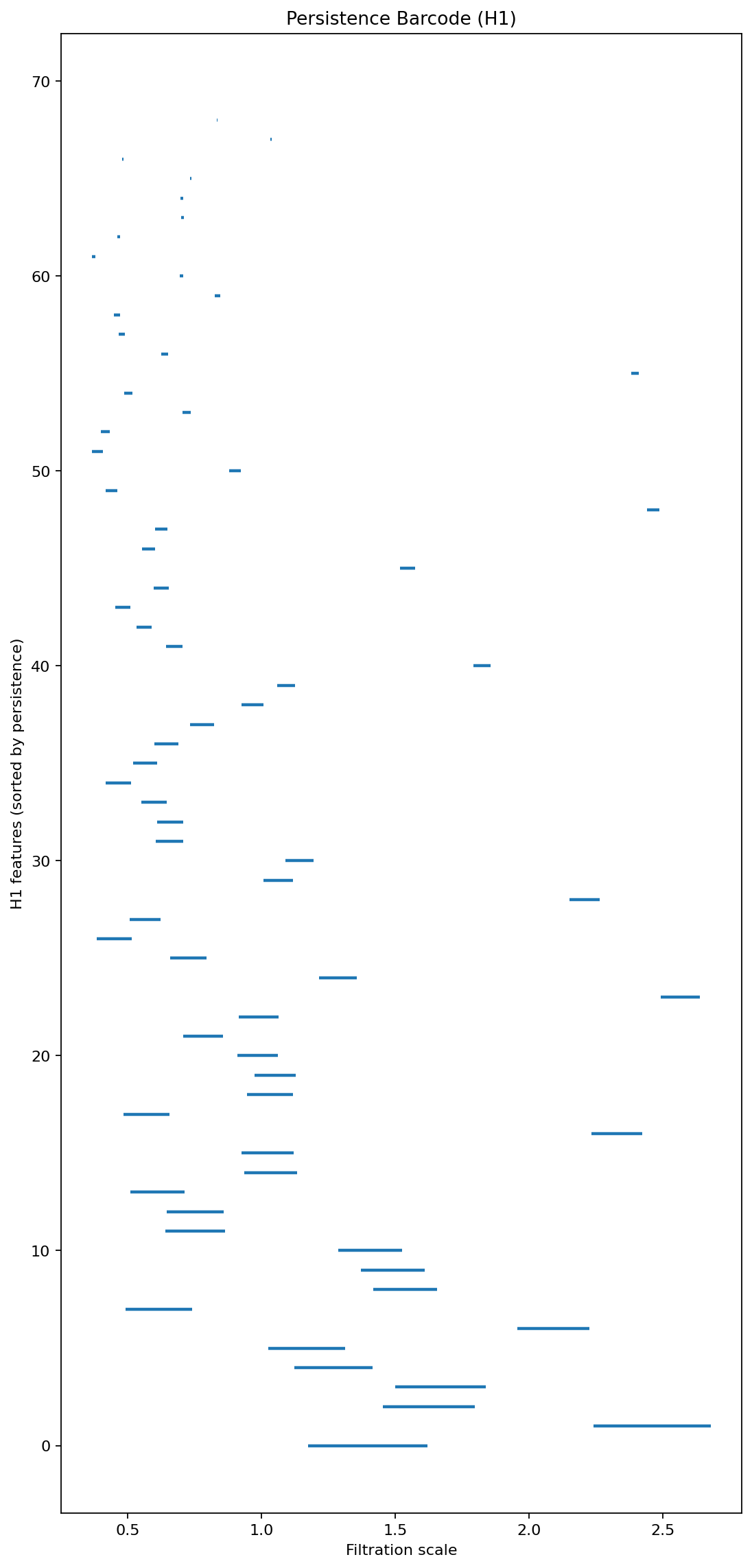 ) to obtain barcodes/diagrams - Summarize: $b_0, b_1$, mean persistence of $H_1$, top loops